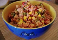 Während dessen die Tomaten, Frühlingszwiebeln und Paprika in ca. 1 cm große und gleichmäßige Stücke schneiden sowie den Mais gründlich abtropfen lassen. Anschließend die Zutaten in die abgekühlte Couscous geben und so lange umrühren bis alles gut verteilt ist.